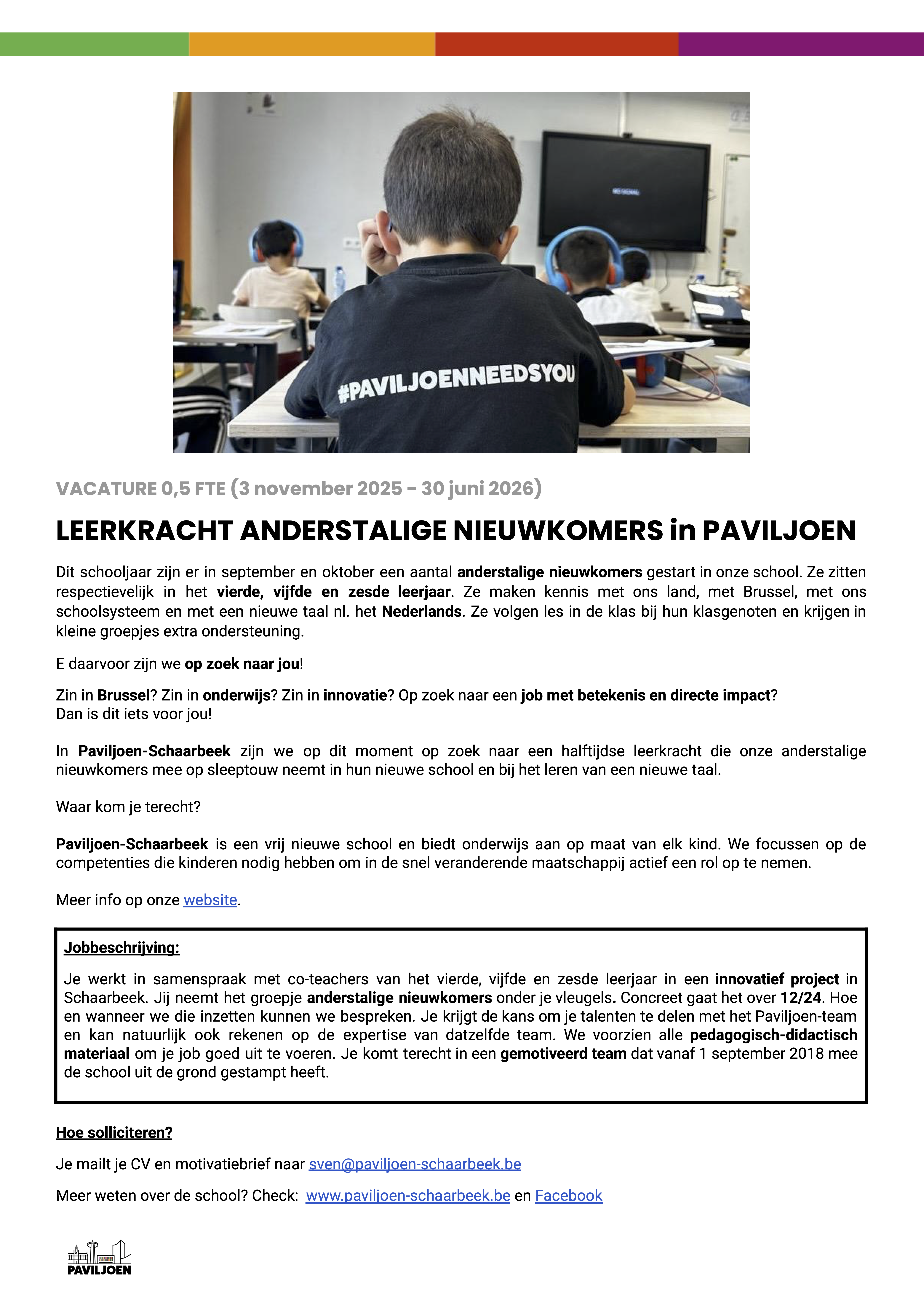 Zin in Brussel? Zin in onderwijs? Zin in innovatie? Dan ben jij de leerkracht die we zoeken. Paviljoen in Schaarbeek is een nieuwe school en biedt onderwijs aan op maat van elk kind. We focussen op de competenties die kinderen nodig hebben om in de snel veranderende maatschappij actief een rol op te nemen. We zien de school en het netwerk errond als een educatief ecosysteem waarin het onderwijs van vandaag een gedeelde verantwoordelijkheid is van de school, de ouders, betrokken partners en het kind zelf. Vanuit een positief schoolklimaat waarin alle kinderen leren van en met elkaar ontwikkelen onze kinderen tot zelfbewuste, kritische en creatieve jongeren.