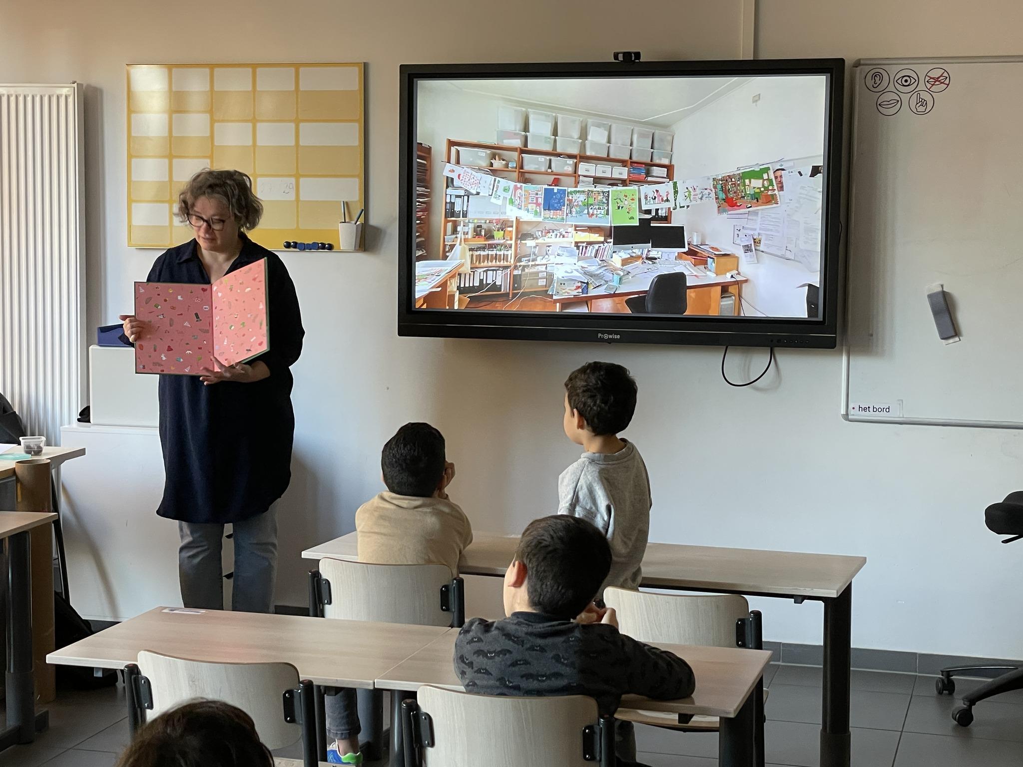 Zo kwam Marjolein Pottie, de illustratoer van het boek 'Tijd voor feest' langs in de klas. Ze vertelde hoe ze de tekeningen maakt en las het verhaal voor.